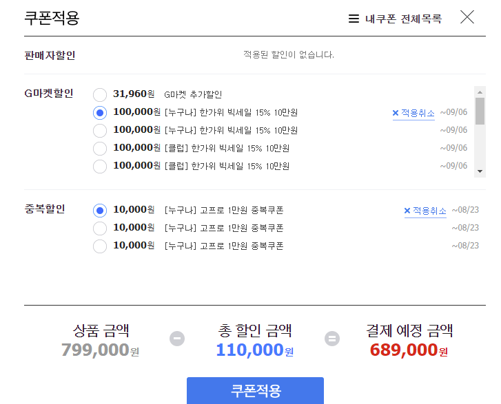 누구나 받을 수 있는 10만원 + 1만원 쿠폰 적용하면 689,00원 구입가능하시구요.