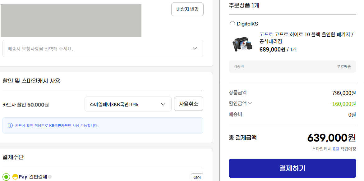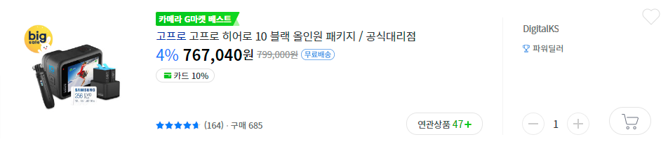 액티비티 좋아하시고 여행 좋아하시면 아주 괜찮은 고프로 히어로10 블랙 올인원 패키지가 농협카드,KB카드,삼성카드가 639,000원, 일반가 689,000원에 떴습니다.